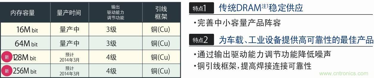 另外,DRAM的主流產(chǎn)品逐漸向大容量、高速化的DDR2/DDR3-SDRAM發(fā)展,中小容量SDRAM的供應(yīng)越來(lái)越不穩(wěn)定。LAPIS Semiconductor將中小容量的SDRAM定位為傳統(tǒng)DRAM注1,作為唯一可長(zhǎng)期供貨的日本國(guó)內(nèi)制造商,不僅面向車載用途市場(chǎng),而且面向更廣闊的工業(yè)設(shè)備市場(chǎng),正在不斷完善產(chǎn)品的產(chǎn)品陣容。