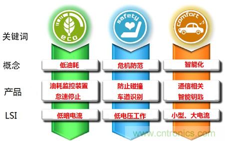 第一個(gè)關(guān)鍵詞是 "環(huán)保" (eco)。這在HV(混合動(dòng)力汽車)、EV(電動(dòng)汽車)向普通車輛的普及過(guò)程中作用顯著。另外,各汽車制造商之間的低油耗化競(jìng)爭(zhēng)也日益激化。這些突破是由復(fù)雜且周密的電子化控制來(lái)實(shí)現(xiàn)的,當(dāng)然隨著HV、EV的普及和油耗性能的提升,所搭載的電子設(shè)備還會(huì)繼續(xù)增加。