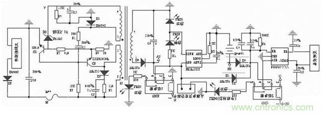 變壓器T1 的122 繞組加至開關(guān)管Q1的集電極( c) ,另一路經(jīng)過R1 為Q1 提供基極電壓。當基極( b)的電壓為高電平時, Q1 開始導通,變壓器T1 的122 繞組中產(chǎn)生1 正2 負的電動勢,經(jīng)T1 耦合,在T1 的324 繞組中產(chǎn)生3 正4 負的感應(yīng)電動勢,此電動勢經(jīng)R5 ,C2 疊加到Q1 的基極( b) ,使Q1 迅速飽和導通。由于變壓器T1 的122 間的電流不能突變,在此過程中會產(chǎn)生1 負2 正的電動勢。變壓器T1 的324 繞組中感應(yīng)出3 負4 正的電動勢,通過R5 , C2 ,使Q1 迅速進入截止狀態(tài)。經(jīng)R1 對C2 的不斷充電, Q1 又開始導通,進入下一輪的開關(guān)振蕩狀態(tài)。在導通期間, T1 變壓器的副邊繞組526,經(jīng)整流二極管D4 向外輸送能量。
