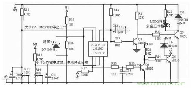 當鋰電池電壓低于315V 時,即電池電量釋放92%以上時,認為不能繼續(xù)放電,否則鋰電池內(nèi)部介質(zhì)會發(fā)生變化,致使充電特性變壞,容量降低等。為此設(shè)計過放電保護控制電路,此電路的具體設(shè)計如圖3,分析如下:采用了LM 2903的1,2,3 腳組成的一路比較器,與外圍器件構(gòu)成過放電壓比較器,R12 , R14分壓后接至LM 2093 的3 腳。當電壓值小于315V 時,分壓值小于214V,LM 2903的1 腳由高電平轉(zhuǎn)變?yōu)榈碗娖剑?Q4 由導通轉(zhuǎn)變?yōu)榻刂範顟B(tài), Q6 飽和導通,JDQ2 工作,同時過放紅色指示燈亮。