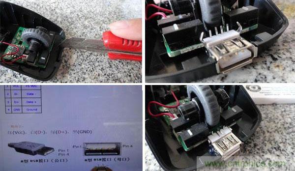開(kāi)USB座口,引腳定義,只要兩邊的兩個(gè)腳,也就是+5V和地。
