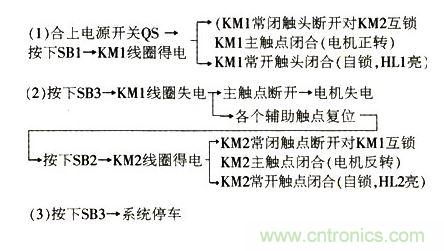 2) 檢查自鎖環(huán)節(jié)。用萬用表 R × 10 擋或 R × 100 擋,將兩表筆分別接在圖中 2 、 5 兩點,正常情況萬用表指針此時應指在“∞”位置。萬用表指針指示正常后,手動交流接觸器 KM1 ,若萬用表指針向右偏轉(zhuǎn),說明自鎖輔助動合觸點 KM1 接線正確且動作良好.萬用表指示的電阻值為交流接觸器線圈的直流電阻。然后,松開交 流接觸器 KM1 .使萬用表指針回到“∞”位置。再手動交流接觸器 KM2 ,若萬用表指針向右偏轉(zhuǎn),說明自鎖輔助動合觸點 KM2 接線正確且動作良好。