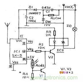 IC1是一只SX-3型人體接近開關(guān)集成電路模塊,該器件最大探測(cè)距離可達(dá)10米。其中紅線接正電源端,黑線接公共端,黃線為+5v電源輸出端,供外部使用,藍(lán)線為即時(shí)開關(guān)信號(hào)輸出端(本電路不用),綠線為具有時(shí)間累積功能的延時(shí)開關(guān)信號(hào)輸出端。220V市電由C1降壓、D1整流、C2濾波、DW穩(wěn)壓后為控制電路提供12V直流電源。平時(shí),沒有人接近IC1或當(dāng)行人很快從報(bào)欄前經(jīng)過(guò)時(shí),IC1的VO2端輸出低電平,后級(jí)電路不動(dòng)作,燈不亮。當(dāng)有人要看報(bào)在報(bào)欄前停頓數(shù)秒后,IC1的V02端輸出高電平。白天時(shí),光敏電阻Rcds為低阻值,V1導(dǎo)通,V2截止,后級(jí)電路仍不能工作。晚聞Rcds為高阻值,V1截止,的高電平使V2導(dǎo)通,光電耦合器IC2內(nèi)藏發(fā)光二極管發(fā)光,光敏可控硅開通,燈泡ZD發(fā)光。閱報(bào)者離開后,IC1V02端又變?yōu)榈碗娖剑琙D自動(dòng)熄滅。