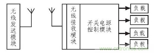 本系統(tǒng)由無(wú)線發(fā)送模塊、無(wú)線接受模塊和開(kāi)關(guān)電源控制模塊3部分組成,其系統(tǒng)構(gòu)成如圖1所示。
