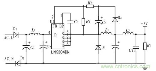 無(wú)線接收模塊由兩部分組成,供電部分由LNK304DN($0.5040)及外圍電路組成,該電路可將220 V交流電壓轉(zhuǎn)換成直流5 V電壓,分別給接收模塊和控制模塊的處理器供電,電路圖如圖3所示。
