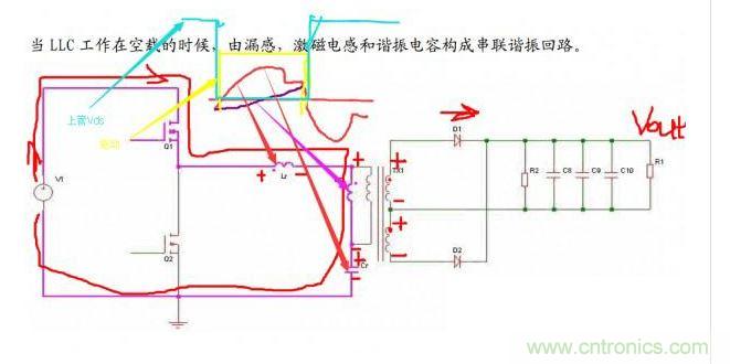 注意不同顏色畫的驅(qū)動、Vds、電流波形。諧振腔電流紅色的是諧振腔總電流,紫色的是勵磁電流,因為次級二極管導(dǎo)通,Lm端電壓被鉗位到n*(Vout-Vf),所以勵磁電流是線性上升的。