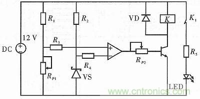 其由光電轉(zhuǎn)換模塊和光敏電阻組成。光電轉(zhuǎn)換由比較器來實現(xiàn)。當(dāng)光敏探頭感應(yīng)的光照強(qiáng)度不強(qiáng)時,比較器會輸出高電位,否則輸出低電位。具體電路如圖6所示。R1分擔(dān)電路電壓,依照外界環(huán)境條件,選擇適當(dāng)?shù)碾娮鑂2,控制比較器中正相輸入的電壓值,使其作為比較器工作的參考電壓;R3起到保護(hù)光敏電阻以及分壓的作用。光敏電阻的阻值隨著外界光強(qiáng)的變化而變化,這樣就可將光信號變換成電壓信號,以此作為信號電壓連接到比較器的反相輸入端。比較兩個輸入端的電壓大小。若信號電壓較小,比較器輸出高電平,否則比較器輸出低電平。從而實現(xiàn)在明亮條件下輸出低電平,在黑暗條件下輸出高電平的設(shè)計要求。