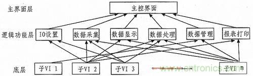 我們采用自頂向下的設(shè)計方式,將系統(tǒng)分為3層:主界面層、邏輯功能層和底層。“主界面層”主要包括主人機界面和系統(tǒng)總體控制。“邏輯功能層”負責系統(tǒng)的各種邏輯功能,例如I/O設(shè)置、數(shù)據(jù)采集、數(shù)據(jù)處理、數(shù)據(jù)管理和數(shù)據(jù)查詢等。“底層”則是一個個按照基本功能劃分子VI,供給高層次VI調(diào)用。采用調(diào)用子VI的形式來實現(xiàn)模塊之間的調(diào)用和關(guān)聯(lián)。當調(diào)用子VI時,系統(tǒng)需要花費很少的開銷,大概幾十毫秒的時間。測試系統(tǒng)的軟件層次結(jié)構(gòu)圖3所示。