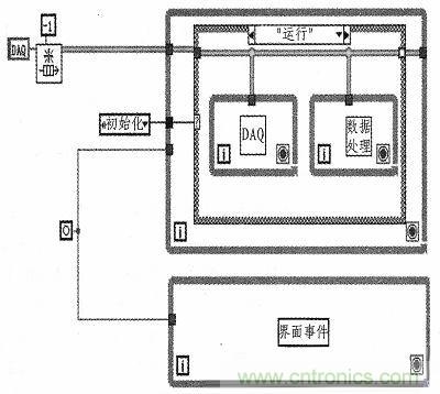 圖4是測試系統(tǒng)軟件的總體架構(gòu)。其主要要點是:用while循環(huán)實現(xiàn)系統(tǒng)狀態(tài)機,用事件結(jié)構(gòu)監(jiān)控界面按鈕事件(用戶點擊各種按鈕)和用戶自定義事件,上述2者用事件進行同步,在狀態(tài)機的“運行子狀態(tài)”中,用隊列同步數(shù)據(jù)采集和數(shù)據(jù)處理顯示。