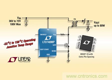 LT3748MP 的工作結溫范圍為 55°C 至 150°C,該器件采用 MSOP-16 封裝,并去掉了 4 個引腳以提供額外的高壓引腳間隔。