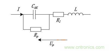 根據(jù)鋁電解電容的物理結(jié)構(gòu),可以用圖 1中所示的電路等效,其中CAK代表兩電極間的理想電容量;Rp是并聯(lián)電阻,代表了電容的漏電流成分;Rl代表了電容引出端及電極部分的串聯(lián)電阻成分;L代表了引出線和連接處的等效串聯(lián)電感成分。