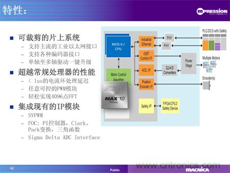同期推出的還有駿龍科技基于MAX® 10 FPGA的電機驅(qū)動方案,通過FPGA實現(xiàn)馬達控制的算法核心,提供了高性能、定制化和單芯片的解決方案,為馬達控制帶來革命性的質(zhì)的飛躍。使用FPGA 替代傳統(tǒng)的CPU/DSP架構(gòu)實現(xiàn)算法,意味著所有的算法都將通過硬件實現(xiàn),這樣由于處理能力限制而在CPU中無法實現(xiàn)的算法,現(xiàn)在都可以在MAX® 10 FPGA中以輕松地實現(xiàn)。Altera的MAX 10支持EtherCAT、Powerlink、Mechatrolink等工業(yè)以太網(wǎng)接口以及Endat 2.2, BISS等編碼器接口,用戶可以該方案中實現(xiàn)靈活可定制的接口。該方案還提供可定制的調(diào)試界面,客戶可以根據(jù)自己的需求,定制自己的調(diào)試界面,實時觀測內(nèi)部信號。