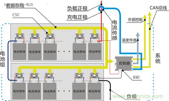 為了解決連線復(fù)雜的難題,出現(xiàn)了分布式架構(gòu)的BMS。這種BMS是將信息采集傳遞的功能與其他功能獨(dú)立分離,整個(gè)系統(tǒng)分成了CSC(單體管理單元)、BMU(電池管理控制器),CSC安裝在單串電池上,負(fù)責(zé)本串電池信息采集和傳遞,每串電池的信息通過總線傳入BMU。這種架構(gòu)通過總線解決了線束復(fù)雜的難題,而且安裝相對簡單,效率高,柔性好,適合不同電池組規(guī)模大小。