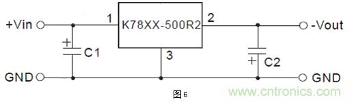 從上面Buck電路以及Buck-Boost電路結構原理來看,主要的區(qū)別是兩者二極管與功率電感的位置互換。因此,若將Buck電路的輸出Vo引腳接成輸入的GND,而之前的輸入GND就變成了負電壓輸出了,即變成了Buck-Boost的電路結構。對應到金升陽K78xx-500R2系列的產品就變成了如下圖6所示的負輸出。