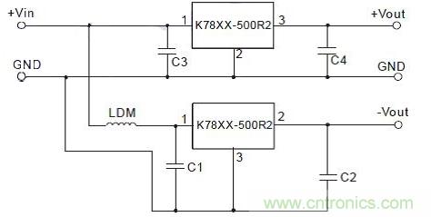 因此,用2只K7812-500R2的產品,實現(xiàn)BUCK與BUCK-BOOST電路相結合,可以得到±12V輸出,低的紋波和噪聲可以給運放進行供電。