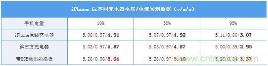 筆者使用了5款不同品牌原配的充電器+2款帶USB輸出的插板進(jìn)行測試(手機(jī)50%電量),發(fā)現(xiàn)輸出電壓基本略微大于5v(某些線補(bǔ)較高的能去到5.3v,而沒有線補(bǔ)的低于5v),而電流也在1a左右。所以使用某些非原裝充電頭對iPhone進(jìn)行充電,確實(shí)會比原裝充電頭更快。當(dāng)然,山寨/品質(zhì)低劣的充電器就另說了。