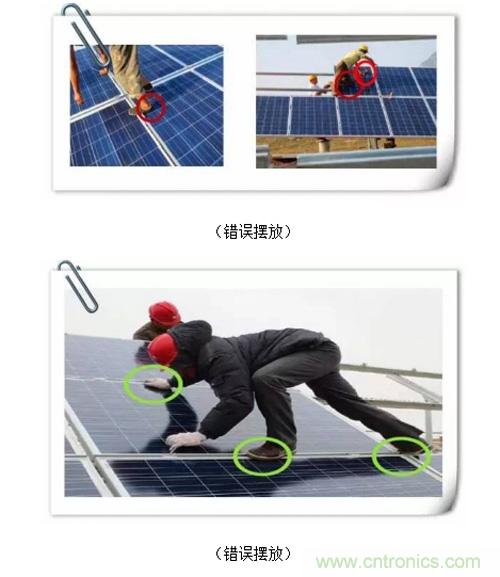 2、組件安裝過程中,應(yīng)盡量避免安裝工人在組件上直接落腳進(jìn)行操作,若必須上人,工人落腳點(diǎn)及手扶著力點(diǎn)只能是組件邊框上。
