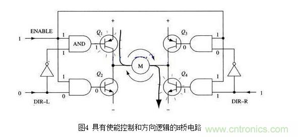 采用以上方法,電機的運轉就只需要用三個信號控制:兩個方向信號和一個使能信號。如果DIR-L信號為0,DIR-R信號為1,并且使能信號是1,那么三極管Q1和Q4導通,電流從左至右流經電機(如圖5所示);如果DIR-L信號變?yōu)?,而DIR-R信號變?yōu)?,那么Q2和Q3將導通,電流則反向流過電機。