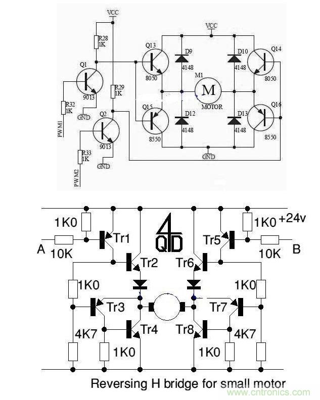 驅動電機時,保證H橋上兩個同側的三極管不會同時導通非常重要。如果三極管Q1和Q2同時導通,那么電流就會從正極穿過兩個三極管直接回到負極。此時,電路中除了三極管外沒有其他任何負載,因此電路上的電流就可能達到最大值(該電流僅受電源性能限制),甚至燒壞三極管?;谏鲜鲈颍趯嶋H驅動電路中通常要用硬件電路方便地控制三極管的開關。
