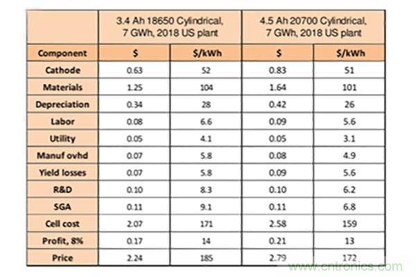 Tesla公開說明選擇20700的優(yōu)勢:“If the new meets the same life and safety requirements, once it is produced at the same yields and at high volume, it will offer about 3-4 % increase in energy density and a 7 % reduction in cost”,即在達(dá)到與18650同樣的良率和產(chǎn)能后,能帶來能量密度增加和成本下降兩個優(yōu)勢,這從下表中也能得到充分體現(xiàn)。