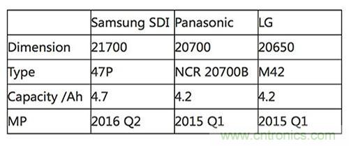 在此前后,Samsung公開開發(fā)21700,LG生產(chǎn)20650型號(見下表)。