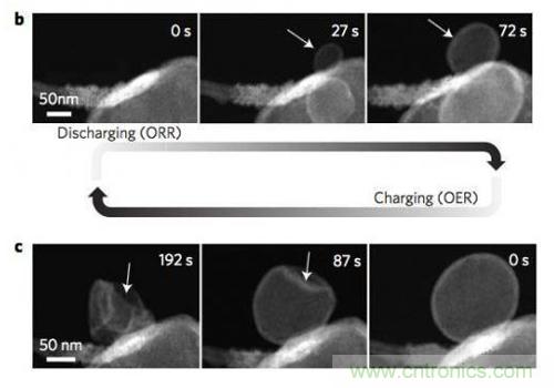 來自美國西北太平洋國家實(shí)驗(yàn)室的Langli Luo等人近日利用環(huán)境透射電子顯微鏡對全固態(tài)Li-O2電池的反應(yīng)機(jī)理進(jìn)行了研究,研究顯示在CNT表面首先形成LiO2化合物,隨后該產(chǎn)物發(fā)生歧化反應(yīng)生成Li2O2和O2,O2的釋放生成了一個外層由Li2O構(gòu)成,內(nèi)層由Li2O2構(gòu)成的中空球狀結(jié)構(gòu)。目前該型研究成果已經(jīng)發(fā)表在了最新的Natural Nanotechnology雜志上。