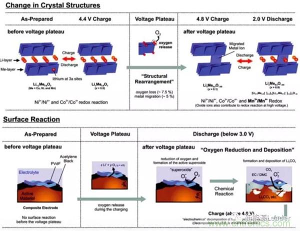 富鋰材料容量高,并且還具有低成本的優(yōu)勢(shì),可以說是非常理想的鋰離子電池正極材料,當(dāng)然任何事情都不可能是完美的,在首次使用的過程中為了發(fā)揮出富鋰材料的高容量,要采用高電壓活化,這一過程中除了形成我們需要的Li2MnO3物相外,也會(huì)生成Li2O,還會(huì)釋放活性氧,這不僅會(huì)破壞富鋰材料自身的結(jié)構(gòu),還會(huì)導(dǎo)致電解液的氧化分解,造成較高的不可逆容量。此外富鋰材料在循環(huán)過程中還存在著層狀結(jié)構(gòu)向尖晶石結(jié)構(gòu)轉(zhuǎn)變的趨勢(shì),這也導(dǎo)致富鋰材料的電壓平臺(tái)在循環(huán)過程中會(huì)持續(xù)的下降,容量不斷衰減,使得富鋰材料循環(huán)性能較差,反應(yīng)機(jī)理如下圖所示。