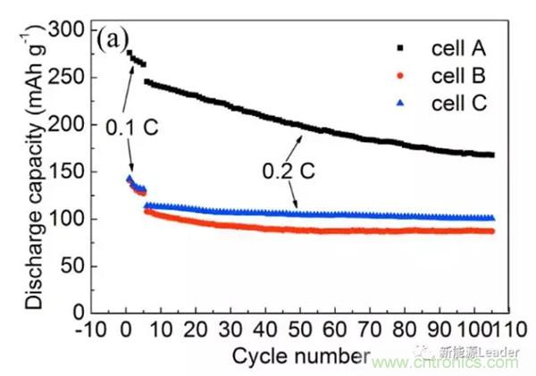 富鋰材料的低溫性能也是阻礙富鋰材料應(yīng)用的一個(gè)重要因素,中國工程物理研究院的Guobiao Liu等對(duì)于富鋰材料低溫下容量下降的機(jī)理做了詳細(xì)的研究,一般認(rèn)為,富鋰材料在低溫下由于活化產(chǎn)生的Li2MnO3材料的數(shù)量較少,導(dǎo)致容量偏低,但Guobiao Liu的研究發(fā)現(xiàn),即便是材料內(nèi)的Li2MnO3含量較高,在低溫下容量發(fā)揮也很低,Li2MnO3含量并不是影響材料容量發(fā)揮的決定性因素,Guobiao Liu認(rèn)為低溫下較差的電極動(dòng)力學(xué)特性會(huì)抑制Mn4+/Mn3+反應(yīng),從而導(dǎo)致材料的容量發(fā)揮較低。循環(huán)性能研究顯示,雖然低溫導(dǎo)致富鋰材料的容量發(fā)揮較低,但是卻顯著的提升了富鋰材料的循環(huán)性能,如下圖所示(電池A在25℃下循環(huán),含有較多數(shù)量的Li2MnO3,電池B,在低溫-20℃下循環(huán)含有較少數(shù)量的Li2MnO3,電池C首先在25℃下活化,然后在-20℃下循環(huán),含有數(shù)量較多的Li2MnO3)。A、B和C三種電池在循環(huán)100次后,容量保持率分別為68.3%、80.9%和88.1%,通過對(duì)三種電池中的富鋰材料的結(jié)構(gòu)研究顯示,低溫很好的抑制了富鋰材料從層狀結(jié)構(gòu)向尖晶石結(jié)構(gòu)轉(zhuǎn)變,從而顯著改善了富鋰材料的循環(huán)性能。