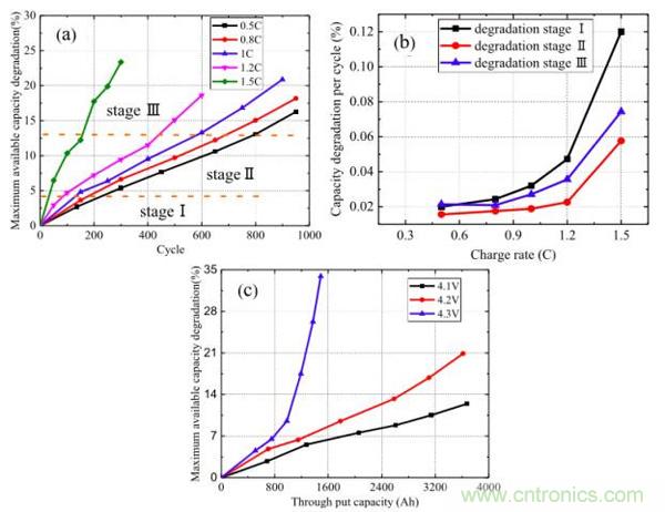 鋰離子電池的放電制度很大程度上依賴于使用者,好的放電制度對(duì)于有的使用者而言并不一定適用。但是充電制度則主要是設(shè)計(jì)者進(jìn)行控制,因此對(duì)于充電制度對(duì)電池壽命衰降的影響的研究,能夠更好的指導(dǎo)我們對(duì)鋰離子電池的設(shè)計(jì)。北京交通大學(xué)的YangGao等針對(duì)不同的充電制度對(duì)鋰離子電池壽命衰降的影響,并研究了其作用機(jī)理,提出了鋰離子電池的壽命衰降模型。YangGao的研究顯示,當(dāng)充電電流和截止電壓超過(guò)一定的數(shù)值時(shí),鋰離子電池的衰降將被極大的加速,為了降低鋰離子電池的衰降速率,需要針對(duì)不同的體系,選擇合適的充放電電流和截止電壓。