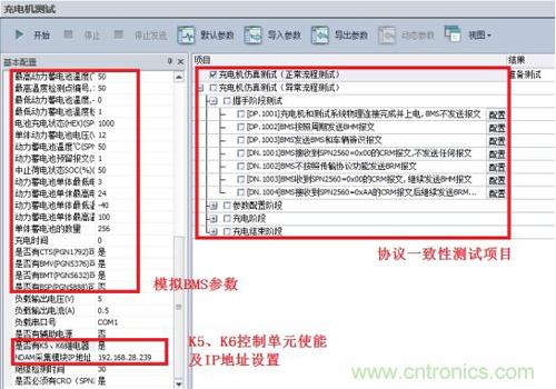 · 啟動(dòng)CANScope對(duì)應(yīng)的充電樁協(xié)議一致性測試軟件ChargerBMS_Tester,選擇BMS仿真測試,配置相應(yīng)信息主要包括模擬的BMS參數(shù)、K5、K6控制單元使能及IP地址設(shè)置。