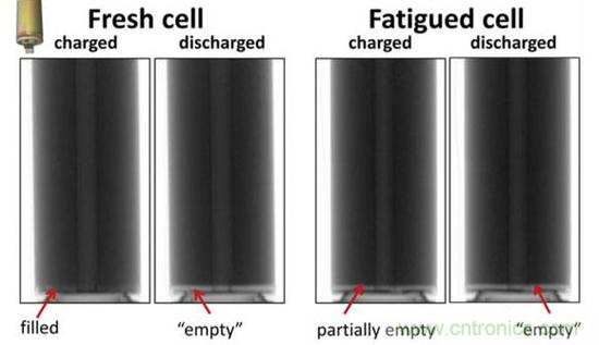 鋰離子電池主要由正極、負極、隔膜和電解液,以及結(jié)構(gòu)件等部分組成,在鋰離子電池的外部,通過導線和負載等,將負極的電子傳導到正極,而在電池內(nèi)部,正負極之間則通過電解液進行連接,在放電的時候,Li+通過電解液從負極擴散到正極,嵌入到正極的晶體結(jié)構(gòu)之中。所以在鋰離子電池中,電解液是非常重要的一環(huán),對鋰離子電池的性能有著重要的影響。理想的情況下,正負極之間應該有充足的電解液,在充放電的過程中都應該具有足夠的Li+濃度,從而減小由于電解液的濃差極化造成的性能衰降。但是在實際充放電過程中,受制于Li+擴散速度等因素,在正負極會產(chǎn)生Li+濃度梯度,Li+濃度隨著充放電而波動。由于結(jié)構(gòu)設計和生產(chǎn)工藝等原因,還會導致電解液在電芯內(nèi)部的分布不均勻,特別是在充電的過程中,隨著電極的膨脹,會在電芯的內(nèi)部形成部分“干區(qū)”,“干區(qū)”的存在導致了能夠參與到充放電反應中的活性物質(zhì)減少,引起電池內(nèi)局部SoC不均勻,從而導致電池內(nèi)局部老化速度加快。M.J. Mu hlbauer在研究鋰離子電池老化對Li分布的影響中曾發(fā)現(xiàn),由于在充放電過程中,正負極極片都存在一定體積膨脹,導致電芯也存在一定程度的體積膨脹和收縮,電芯會如同“呼吸”一般,反復的“吸入”和“吐出”電解液,所以不同時刻,電解液在電芯內(nèi)的浸潤情況也在實時變化(如下圖所示)。