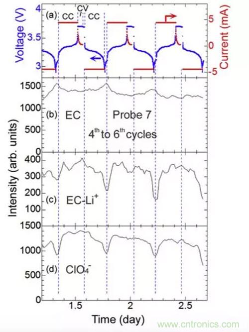 在研究Li+濃度的變化過程中,Toshiro Yamanaka還發(fā)現(xiàn)電解液的分布也隨著充放電而發(fā)生變化。下圖是在充放電過程中不同位置溶劑EC的強度的變化趨勢,EC的強度變化主要反映該處電解液的數(shù)量多少,隨著電芯的體積變化,電芯內(nèi)的電解液分布也在不斷的發(fā)生著變化。例如在1號和2號位置,EC的濃度發(fā)生了兩次快速下降和緩慢恢復,6號探測器的位置,則出現(xiàn)了EC濃度的快速下降和快速上升,這些變化都反映了鋰離子電池內(nèi)部在充放電過程中,由于電極的體積膨脹,導致電解液在電芯的局部發(fā)生變干、再浸潤的過程。