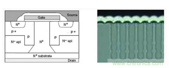 通常,高壓的功率MOSFET采用平面型結(jié)構(gòu),其中,厚的低摻雜的N-的外延層,即epi層,用來保證具有足夠的擊穿電壓,低摻雜的N-的epi層的尺寸越厚,耐壓的額定值越大,但是其導(dǎo)通電阻也急劇的增大。導(dǎo)通電阻隨電壓以2.4-2.6次方增長(zhǎng),這樣,就降低的電流的額定值。為了得到一定的導(dǎo)通電阻值,就必須增大硅片的面積,成本隨之增加。如果類似于IGBT引入少數(shù)載流子導(dǎo)電,可以降低導(dǎo)通壓降,但是少數(shù)載流子的引入會(huì)降低工作的開關(guān)頻率,并產(chǎn)生關(guān)斷的電流拖尾,從而增加開關(guān)損耗。