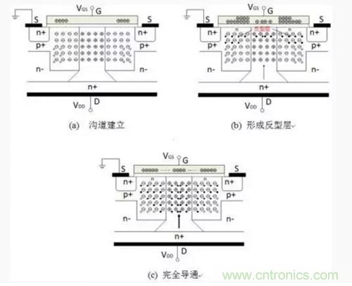 當(dāng)MOS導(dǎo)通時(shí),柵極和源極的電場(chǎng)將柵極下的P區(qū)反型,在柵極下面的P區(qū)產(chǎn)生N型導(dǎo)電溝道,同時(shí),源極區(qū)的電子通過導(dǎo)電溝道進(jìn)入垂直的N+區(qū),中和N+區(qū)的正電荷空穴,從而恢復(fù)被耗盡的N+型特性,因此導(dǎo)電溝道形成,垂直N+區(qū)摻雜濃度高,具有較低的電阻率,因此導(dǎo)通電阻低。