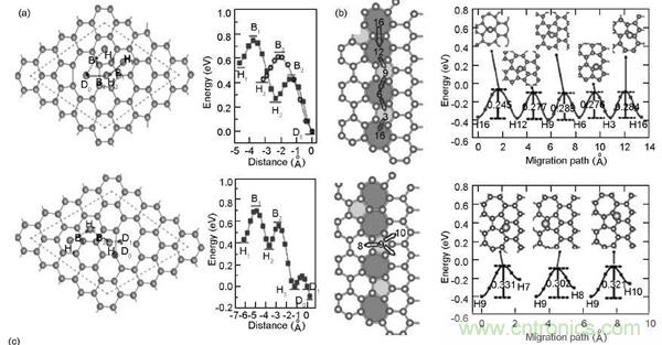 圖7.Li離子擴散過程:(a)平行石墨烯表面;(b)平行石墨烯晶界;(c)透過石墨烯平面