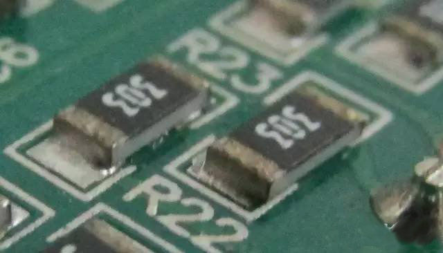 下圖是兩顆電極氧化了的貼片電阻(電極表面有點黑),別看它們現(xiàn)在好好的,一旦電路進(jìn)入了惡劣的工作狀態(tài)(高溫高濕),電阻就會因為虛焊而使電路工作在不可預(yù)測的狀態(tài),繼而損壞。