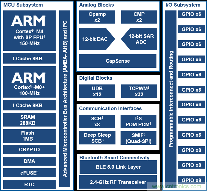 擴(kuò)充處理器容量、內(nèi)存及功耗方面的性能不會(huì)憑空而來。對(duì)于許多應(yīng)用程序而言,底層硬件(例如MCU)需要做出相應(yīng)調(diào)整以適應(yīng)這些特性。因此,生產(chǎn)商在設(shè)計(jì)下一代MCU時(shí)必須時(shí)刻緊記這些要求。例如,賽普拉斯 PSoC 6 BLE MCU(見圖1)為物聯(lián)網(wǎng)設(shè)計(jì)人員提供BLE 5.0所具備的這些功能。
