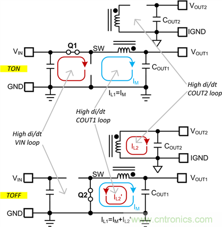 圖 2. Fly-Buck 轉(zhuǎn)換器在一次側(cè)有兩個(gè)高 di/dt 環(huán)路。所有二次環(huán)路都是高 di/dt。