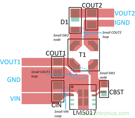 圖 3.基于 LM5017 的 Fly-Buck 布局可對 di/dt 環(huán)路和高 di/dt SW1,2 節(jié)點(diǎn)面積進(jìn)行最小化。