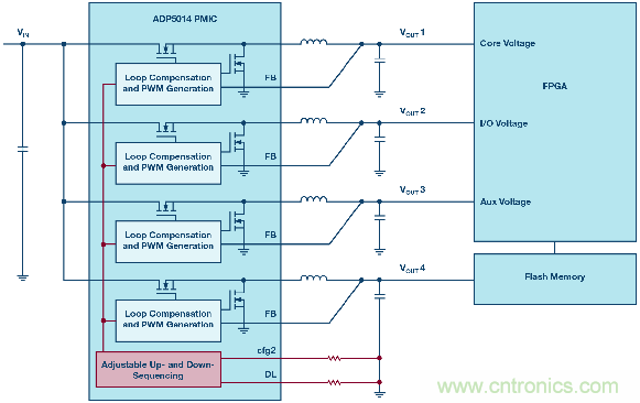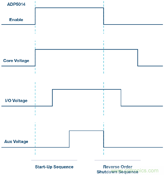 圖2. ADP5014 PMIC集成了對靈活控制上電/關(guān)斷時(shí)序的支持。
