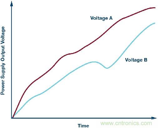 除了電壓時(shí)序之外,啟動(dòng)過程中還可能要求電壓單調(diào)上升。這意味著電壓僅線性上升,如圖4中的電壓A所示。此圖中的電壓B是電壓非單調(diào)上升的例子。在啟動(dòng)過程中,當(dāng)電壓上升到一定電平時(shí)負(fù)載開始拉大電流,就會發(fā)生這種情況。防止這種情況的一種辦法是延長電源的軟啟動(dòng)時(shí)間,并選擇能夠快速提供大量電流的電源轉(zhuǎn)換器。
