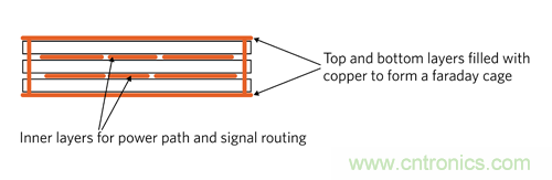 b.PCB 的頂層和底層布局帶有屏蔽接地區(qū)域,利用一個過孔將其連接起來,以模擬法拉第籠。所有高 di/dt 環(huán)路布置在 PCB 的內(nèi)層,所以法拉第籠就能夠屏蔽電磁場, 防止向外輻射。該方法成本較低,通常足以抑制 EMI。圖 10 為該技術(shù)的示意圖。