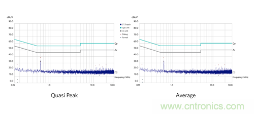 圖 12:MAX17502 EMI 評估板傳導 EMI 測試結(jié)果。左:準峰值;右:平均值。
