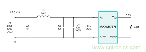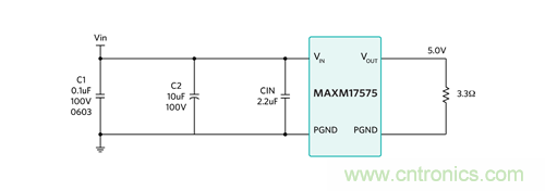 例:以 Maxim 的喜馬拉雅 SiP 電源模塊 MAXM17575 為例,器件采用 4.5-60Vin、0.9-12Vout,提供最大 1.5A 電流。以 MAXM17575 評估板為例,最小輸入電壓為 7.5V。輸出負載為 RO = Vo/Io = 5V/1.5A =3.3?。最大工作占空比為 D = VO/VINmin = 5V/7.5V = 0.66。所以,最低可能輸入阻抗為 RIN = RO/D2 = 3.3 ?/0.662 = 7.6?。