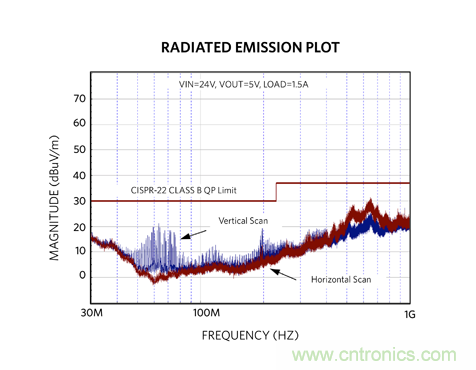 MAXM17575 本質(zhì)上具有極低的輻射 EMI。對于輻射測試,傳導 EMI 測試中所示的輸入濾波器不需要也沒有使用。使用輸入濾波器能夠為輻射測試提供更大的裕量。