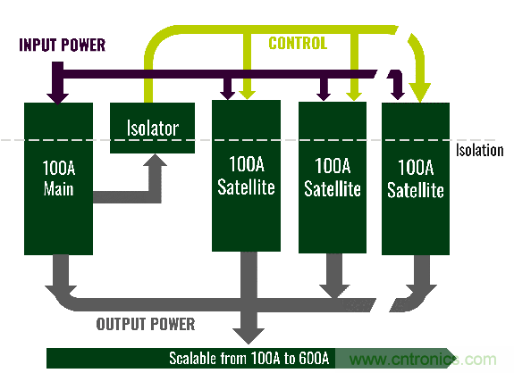 圖字:輸入電源;控制;100A主模塊;隔離器;100A從模塊;隔離;輸出電源;從100A到600A可擴(kuò)展