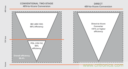 圖字:12V總線(xiàn);48V總線(xiàn);傳統(tǒng)的兩級(jí)48V至Vcore轉(zhuǎn)換;IBC(48V-12V);96%效率;POL(12V-1V);90%效率;總效率為86.4%;直接48V至Vcore轉(zhuǎn)換;直接至Vcore轉(zhuǎn)換器;>91%或更高的效率