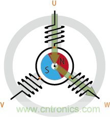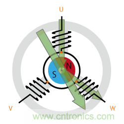 圖3:轉子的永久磁石會像被合成磁通量牽引一樣旋轉,電機的軸也會因此旋轉