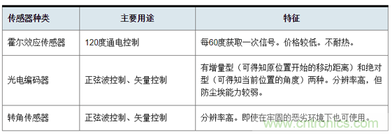 表1中顯示的是BLDC電機主要的位置檢測用傳感器的種類。根據控制方式的不同,需要的傳感器也是不同的。在120度通電控制中,為判斷要對哪個相通電,配備了可每60度輸入一次信號的霍爾效應傳感器。另一方面,對于精密控制合成磁通量的“矢量控制”(在下一項中說明)來說,轉角傳感器或光電編碼器等高精度傳感器較為有效。