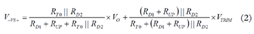 VS+引腳上的正常工作電壓為1 V。若VTRIM為1 V左右且RT0遠(yuǎn)大于RD2,則可忽略電路的其余分支部分。復(fù)合網(wǎng)絡(luò)用作簡單分壓器,并調(diào)節(jié)RUP電阻值,提供類似于模擬控制器的特性,實(shí)現(xiàn)了模擬電源模塊中的電壓向上調(diào)整。
